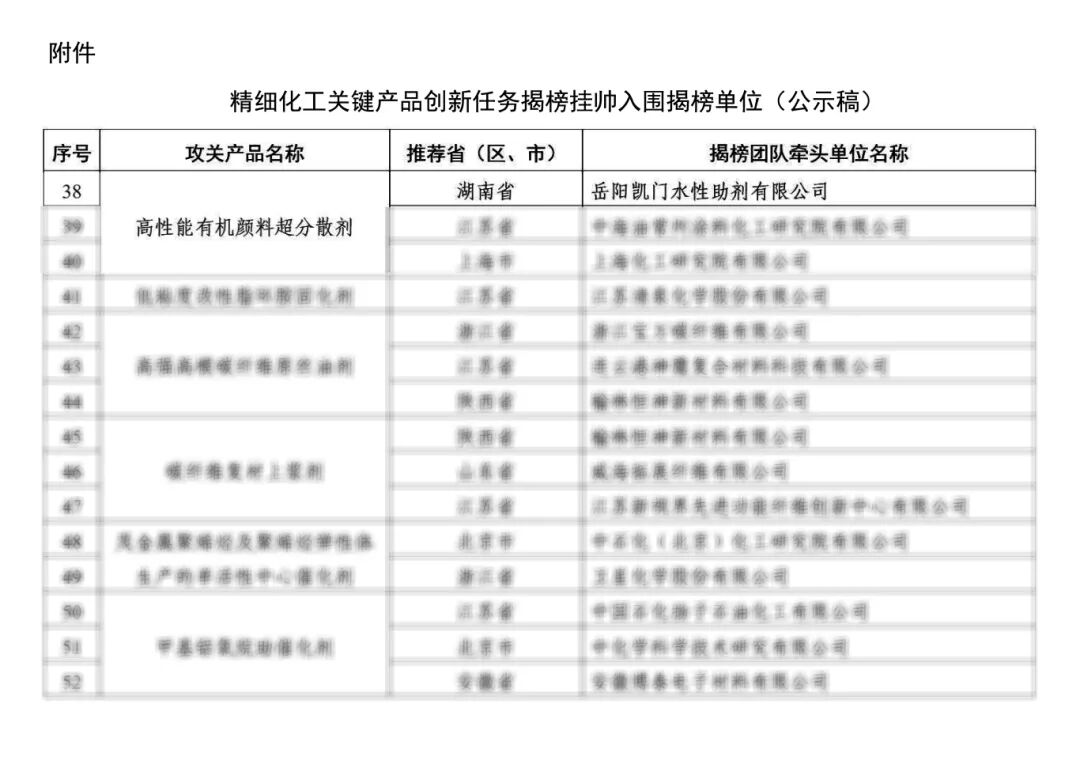 “揭榜挂帅”是国家推进关键核心技术攻关的重要机制,本次入围,标志着岳阳凯门在精细化工助剂领域的技术创新能力与产业化成果获得国家级权威认可,综合竞争力已达行业先进水平。